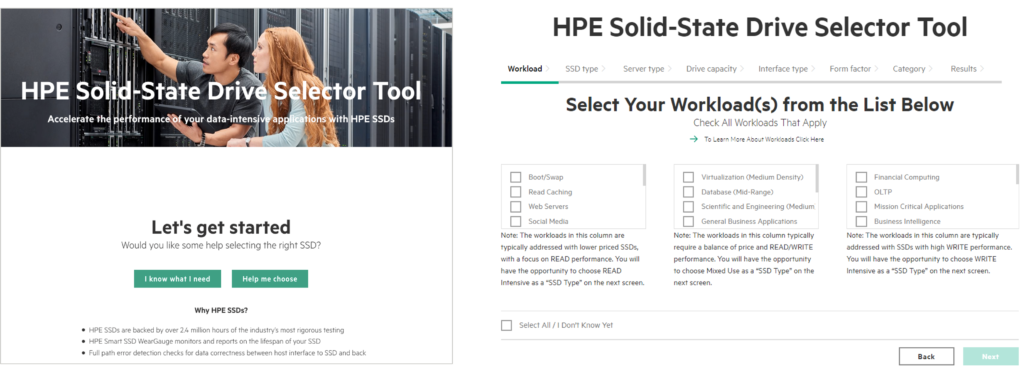 The HPE Solid-State Drive Selector Tool is an online tool that helps guide the process for selecting the right SSD drive for the chosen workload. In addition to the easy-to-follow guided process, the tool includes an alternative, manual driven, expert mode with fine-grained selection process.
